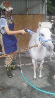 飼育員お仕事は、色々ありますが、動物の身の周りのお世話や お掃除、お手入れも大切です! 今日は、ポニーのリンちゃんのシャンプーを発見しました! リンちゃんも気持ちよさそうです!!